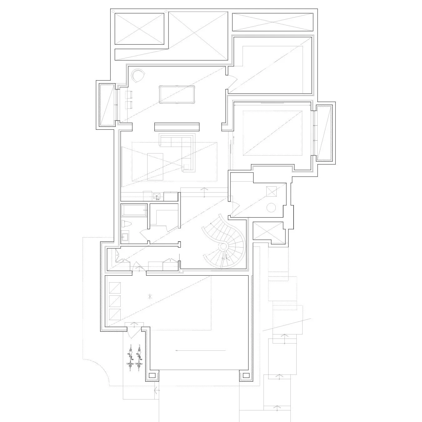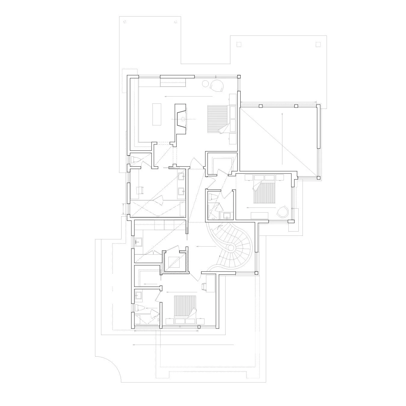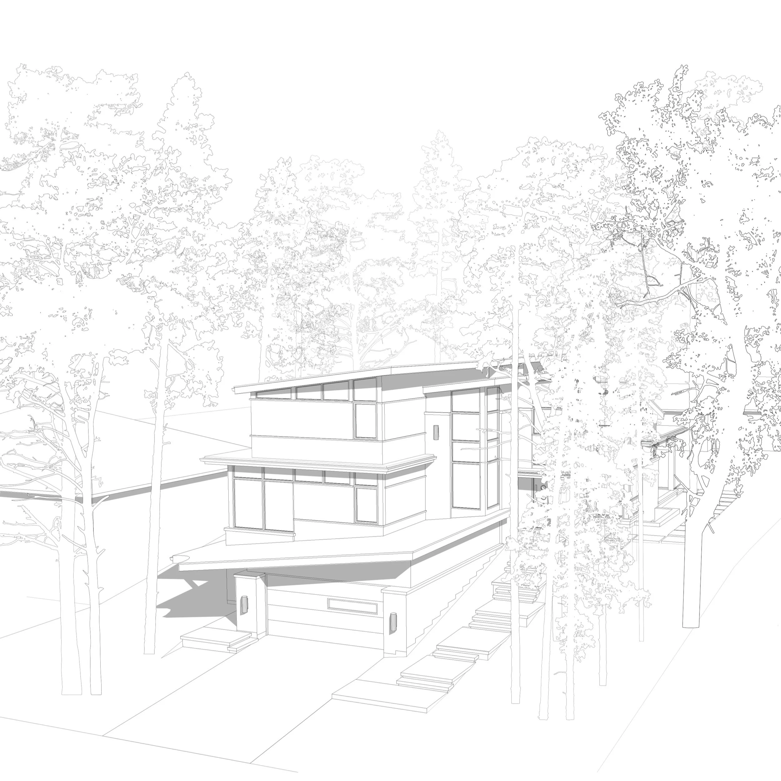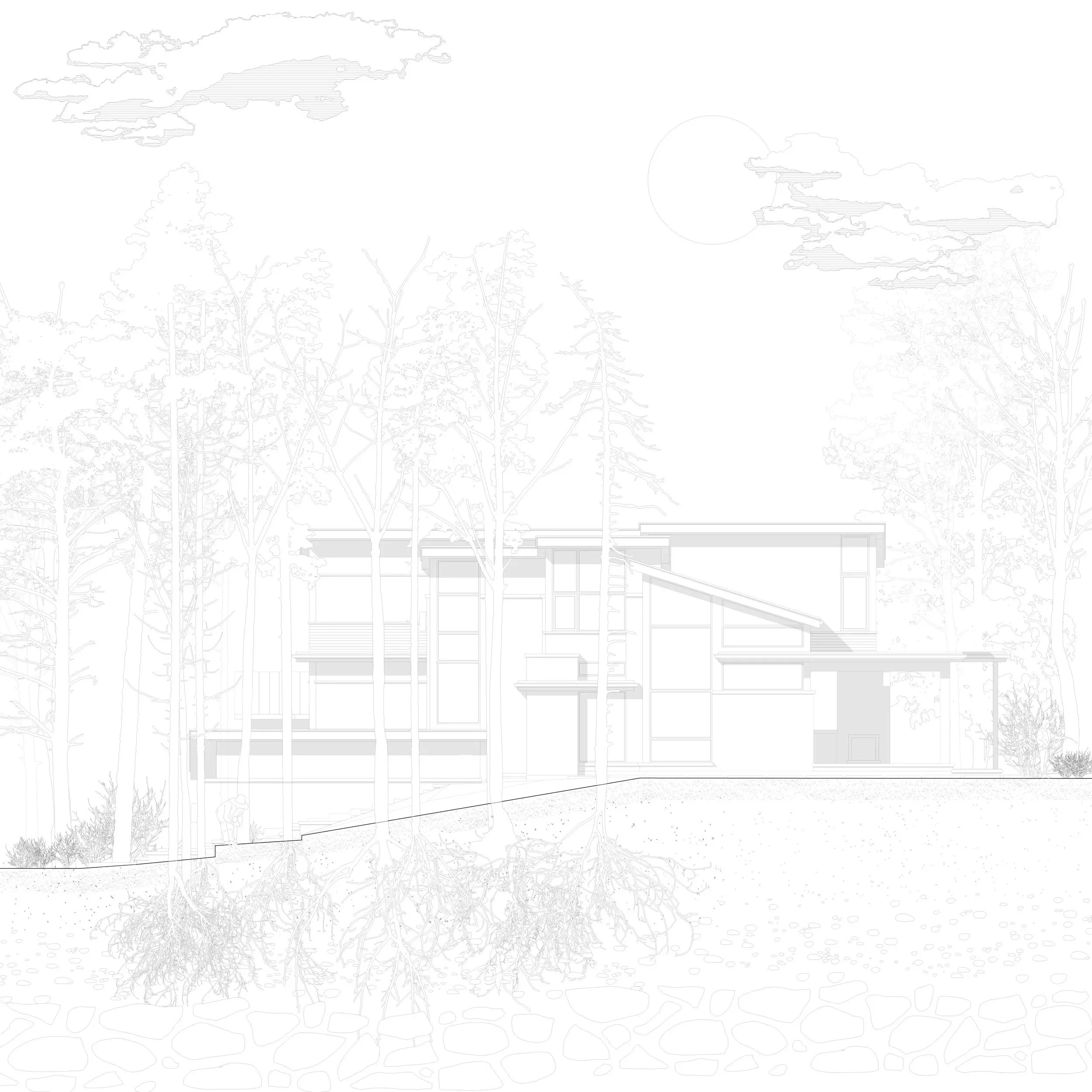 The massing and spatial organization emerge through careful negotiation with the existing trees, which are preserved as defining elements of the site. Interior spaces are arranged to frame views, shape circulation, deliver the program, and establish a layered relationship between the building and its surrounding.